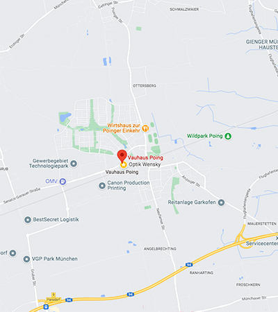 Poing erreichen Sie mit dem PKW am schnellsten über die A94 München/Passau, Ausfahrt 9 „Parsdorf“ oder 9a „Poing“.